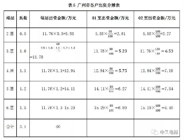 (2)《廣州市既有建筑加裝電梯辦法》(穗府辦規(guī)〔2016〕11號(hào))規(guī)定,業(yè)主可以參考如下比例約定出資、維護(hù)和養(yǎng)護(hù)費(fèi)用的分?jǐn)偅阂缘?層為參數(shù)1.0、第2層為0.5、第1層為0,從第4層開始每增加一個(gè)樓層提高0.1個(gè)系數(shù),即第4層1.1、第5層1.2、第6層1.3,并依此類推出資比例;同一樓層各戶的出資比例可以按照業(yè)主專有部分占該層建筑總面積的比例確定。